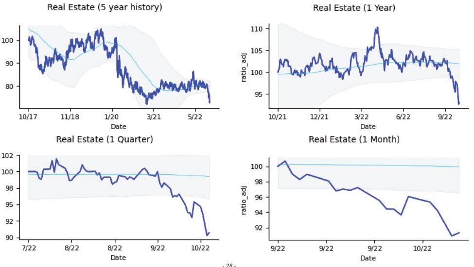 One of the more impressive moves in the market is the recent relative weakness in Real Estate. (See, for instance, IYR and other ETFs.) The chart below shows the relative performance of the sector to the S&P 1500. We’ve seen some other interesting shifts, including minor relative weakness in some key defensive sectors. At this point, we think most of these moves are noise, but are watching for them to develop into something more.