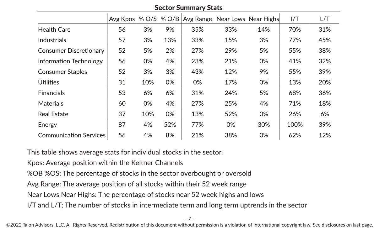 The table below shows one of the ways we like to slice and dice sectors. This is an analysis of the individual stocks of the S&P 500, sorted into major sectors.