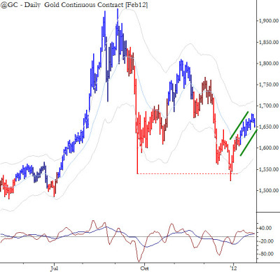 [dc]T[/dc]his pullback in Gold futures could offer an opportunity for a short. Positions could be established on a weak close, looking for a first leg to retest previous lows (1,525 - 1,540 basis February contract).