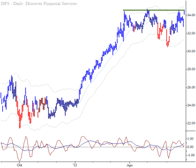 Watch DFS in a breakout above resistance (roughly 34.45 – 34.75.) Resistance levels are usually not clear lines, but rather rough "zones" where selling pressure has previously been able to overcome buying pressure. Multiple tests of a level can often set up a good run above resistance, but entering these trades can be problematic due to volatility around the breakout itself. One solution is to enter partial positions on the actual breakout (perhaps confirmed on close here) and the remainder in the first consolidation above resistance.
