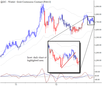 Continued from this chart earlier this week, Gold shows further evidence of breaking down. If you do not have a position, use small daily consolidations to position short, for example, entering on a stop (or a stop-close-only) below yesterday's low. You are still essentially trading a weekly pattern, so wide stops are justified. This trade has potential at least down to the mid 1,500's, with the possibility of a dramatic breakdown below that level.
