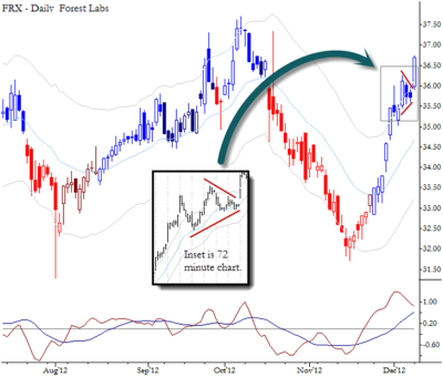 I have written before on the importance of being able to identify volatility compression. This chart of FRX shows an example where a chart pattern could have alerted you to volatility compression. Note the two inside bars on the daily chart, which "hides" a triangle on the intraday chart. When you see a pattern like this, it warns you that any breakout is likely to see continuation. How you use this information depends on the situation: it can be motivation for an outright trade, can affect risk management decisions (particularly on higher timeframe), can set the stage for options trades that are long a lot of volatility (though timing can be difficult). At the very least, do not be caught fading a move out of a pattern like this.