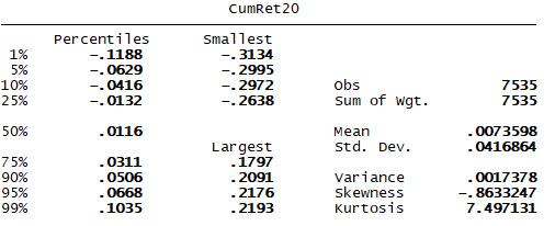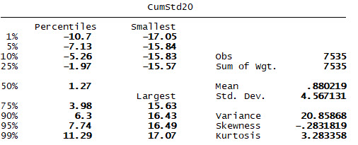 Another idea would be to consider volatility-adjusted returns, and our Sigma Spikes provides a good measure. Let's create another variable, CumStd20, which is the sum of sigma spikes over the past 20 trading days, and run the same moving window analysis. Here are summary stats for that measure: