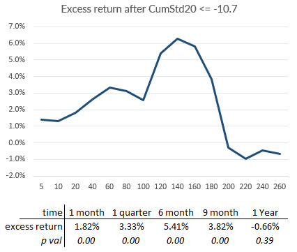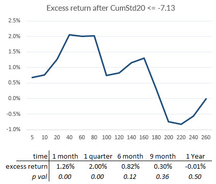 Again, we can note the average of this measure is a small positive, and it's perhaps surprising that it seems to be fairly symmetrical. Let's re-create the test using the 1st percentile of the CumStd20 as the trigger:
