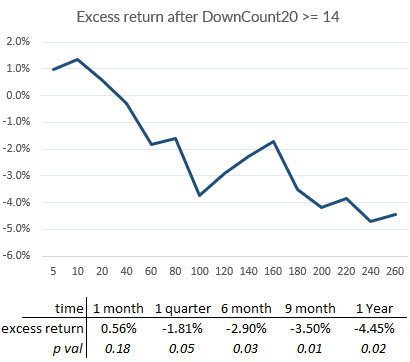 Simple binary counting variables are often more powerful than we might expect. In this case, let's create a variable (DownCount20) that simply counts the number of days that closed lower over the previous 20 trading days. (20 would mean all days closed down. The average of this measure is 9.4, reaffirming the intuition that stocks are slightly more likely to close up than down.)