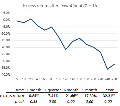The largest value in the dataset is 16, and here's what happens afterward. Note in advance, when the market gods appear to give us a statistical gift, we should be suspicious!