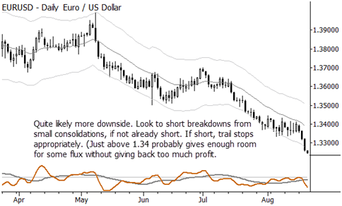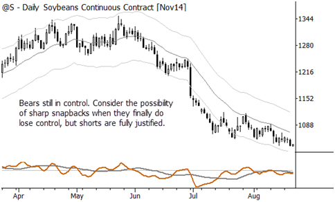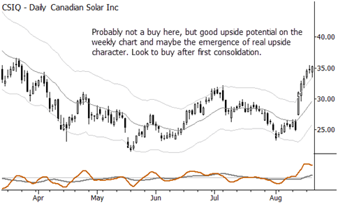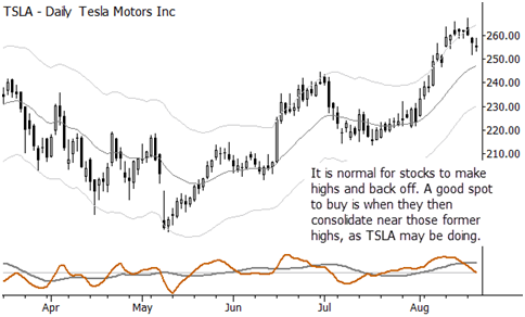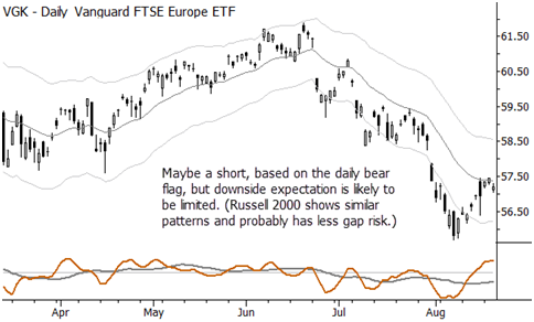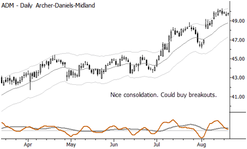 Here are a few trading ideas. Some may be immediately executable; some may need to go on a watchlist. In most cases, these are consolidation plays and could be entered on short term breakouts (e.g., breakout of previous day's high, if looking to buy). There's a little bit of everything: individual stocks, a currency, an index short, and a commodity, and a mix of long/short ideas. Last, profit taking is important. These are swing trades, so don't extrapolate into multi-month moves. When those develop and we're lucky to be on board (as we have been for beans and the euro), that's great and a trailing stop will keep you in the trade, but that is not the expectation here. Correct stops, proper risk management, correct position sizes based on risk, disciplined profit-taking, and trailing stops are your friends.