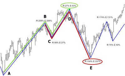 Next, we measure each swing as a percentage of the setup leg. This can be a bit confusing, so refer to the (admittedly pretty ugly) chart above for an example. At point D, the market has made a complete three swing move: the setup leg (A-B), a retracement (B-C), and then an extension (C-D). At point D, we define both the retracement and extension as a percentage of the setup leg. The "R: 27%" means that B-C was 27% of A-B; the E: 53% means that D-C was 53% of AB, not 53% of B-C. This is a possible point of confusion, so be clear on this: both legs B-C and C-D are measured relative to A-B, since A-B is the setup leg for the structure. At point E, we are able to define the next three legged structure, this time based off of B-C as the setup leg, and the percentages at point E show C-D and D-E as percentages of that B-C leg. Those structures are highlighted in green and red to make them stand out more clearly. Spend a few moments thinking about this, so that you are sure of what we're measuring.