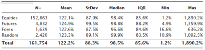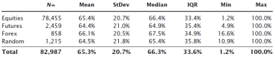 Two points jump out from this table: First, the real market data "look a lot like" the random sample. Though this is not any type of valid quantitative test, it is a good first step when looking at market data. If we compare against a random baseline, we want to see that the market data somehow looks significantly different from random data. Otherwise, there is a good chance that what we are looking at might simply be random, and this is bad because you cannot make money trading something that is random. (I just glossed over a very important point, but a major emphasis of the course I am preparing will be that randomness is, statistically speaking, the enemy of successful trading. Trading and analytical techniques have to be able to overcome randomness or they stand no chance of success. Much more on that concept later. (And yes, I realize that the True Believers may already be saying that of course these ratios are so important that even random number generators would be obeying them. That's also a discussion for another time.)) Second, we can't see any clear evidence of Fibonacci ratios in this table. The average retracement, around 65%, is not the Golden Mean, and the very high standard deviation means that we're not even very "sure", statistically speaking, that the mean is a valid measure.