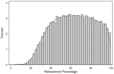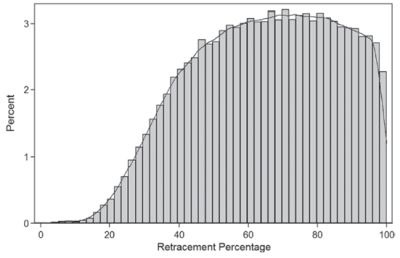 A good next step would be to look at a histogram of the retracements. Maybe we can tease out some evidence of Fibonacci ratios there, especially if we see a bimodal distribution with peaks around some of those important ratios that traders use.