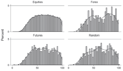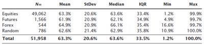 Now that we have the (obviously joking) disclaimer out of the way, I want to continue looking at Fibonacci ratios in market data. (If you haven't already, read this post and this post for background, and, all joking aside, this will be pretty data heavy for a blog post.) What I am going to share today comes from the unpublished portion of my book; one of the bigger parts of that unpublished portion was quantitative work supporting the patterns and tendencies I trade. This work was done on a universe of 600 active stocks; 16 liquid, domestic futures markets; 6 currencies; and several variations of randomly generated price data (pure random walk, GARCH models, "scrambled" price bars, etc. The market data covers 10 years beginning in 2001.)